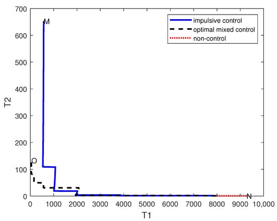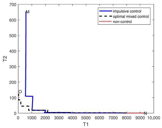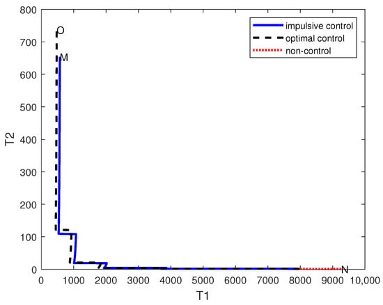 The optimal dosage , the optimal objective function , and and at the terminal time are calculated by using MATLAB software 2018a. Figure 1 shows the optimal dose at a fixed time, Figure 2 shows how the number of drug-sensitive and drug-resistant cells evolves at a given time under optimal pulse control, initial pulse control, and no pulse control. The black dotted line represents the trajectory of the cell under the optimal pulse control, and the blue dotted line represents the trajectory of the cell under the optimal pulse control. O (474.8244, 736.9175), M (571.4893, 653.6824), and N (9265.3104, 0) denote the number of sensitive and resistant cells at the terminal moment under the three control strategies.