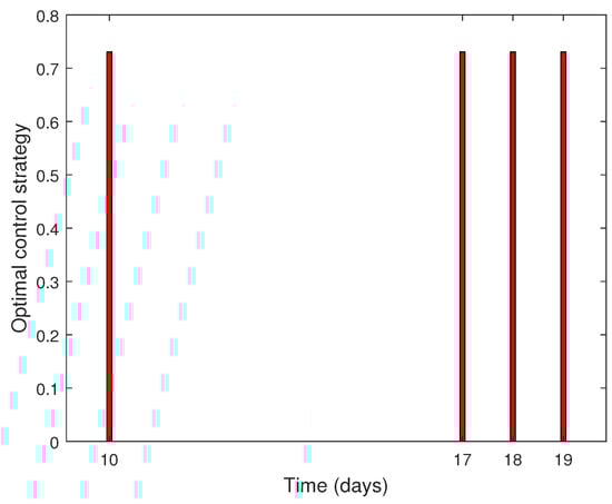 The number of and cells at the terminal moment and the optimal value of objective function is Figure 5 shows the optimal strategy under the combined control of pulse timing and dose. Figure 6 shows how the number of drug-sensitive and drug-resistant cells evolves over a given time period under optimal pulse control, initial pulse control, and pulse-free control. O (25.7732, 139.8360), M (571.4893, 653.6824), and N (9265.3104, 0) indicate the number of terminal-moment-sensitive and -resistant cells under the three control strategies. Obviously, compared to the previous strategy, the tumor burden is further reduced.