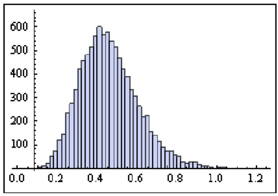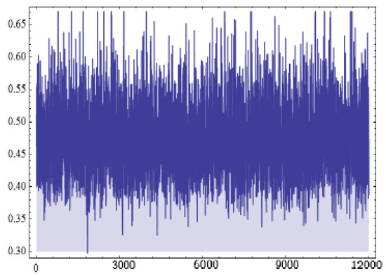 It is now necessary to describe the prior distributions for the parameters and in order to obtain the Bayesian estimate of R. We make the assumption that the noninformative gamma priors for and , i.e., when the hyperparameters are and are applicable as we lack prior knowledge. The initial values for the parameters , and were taken to be their MLEs and in order to run the MCMC procedure outlined in Section 4. Furthermore, 12,000 MCMC samples were produced. We remove the first 2000 samples as ’burn-in’ to eliminate the impact of the initial values. As a result, the Bayesian estimate of R and its corresponding CRI is calculated as and with average interval width . Figure 6 shows R’s 12,000 chain values. The R kernel density estimation and histogram are displayed in Figure 7.