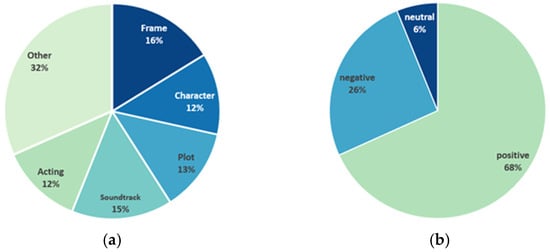 Relevant analysis of online reviews of the movie Titanic. (a) Distribution of attributes in reviews of the movie Titanic. (b) Percentage of emotional tendencies of “Frame” attributes of reviews of the movie Titanic.
