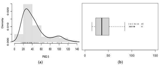 - Cavieres, M.F.; Leiva, V.; Marchant, C.; Rojas, F. A methodology for data-driven decision making in the monitoring of particulate matter environmental contamination in Santiago of Chile. Rev. Environ. Contam. Toxicol. 2020, 250, 5–67. [Google Scholar]