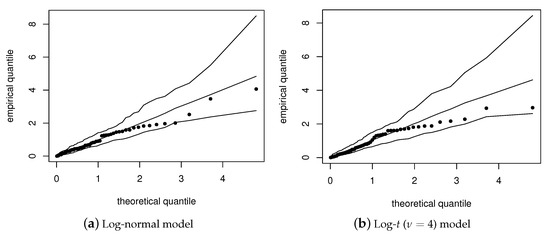 - Paula, G.A.; Leiva, V.; Barros, M.; Liu, S. Robust statistical modeling using the Birnbaum-Saunders-t distribution applied to insurance. Appl. Stoch. Model. Bus. Ind. 2012, 28, 16–34. [Google Scholar] [CrossRef]
