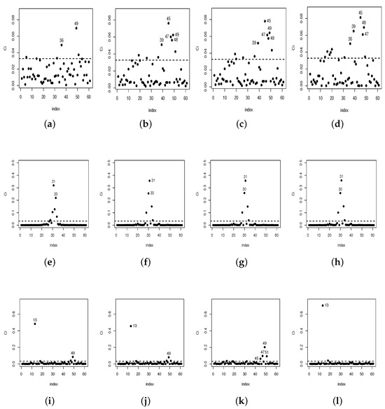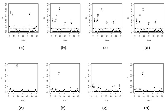 - Cook, R.D. Assessment of local influence (with discussion). J. R. Stat. Soc. 1986, 48, 133–169. [Google Scholar]