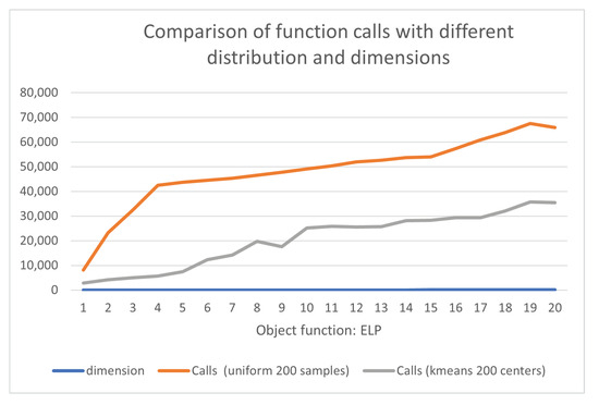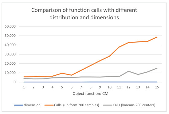 Likewise, a series of experiments was conducted for the CM function with the dimension n increased from 2 to 30, and the results are shown in Table 4 and graphically in Figure 3. The proposed initialization method requires fewer function calls to obtain the global minimum of the function, and also, the average success rate with the proposed initialization method reached 100%, whereas with the uniform distribution, it was smaller by 15%.