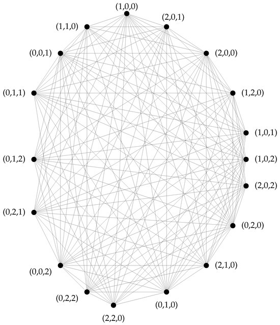 We have ∼, because for , . Therefore, they are adjacent in both and by Lemma 1. Similarly, for and ; so, ∼ in , by Lemma 1. Also, ∼, for , , and , because there exist and , such that . Further, for and , ∼, since there exist and , such that . Similarly ∼ as there exists and such that . Finally, ∼ for and , because there exist and , such that . This implies that the degree of the vertex becomes