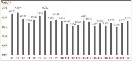 Next, the results of the FF-DEMATEL analysis are obtained by performing the calculations as in the general form of DEMATEL (e.g., Equations (6)–(13)), as shown in Table 8. Here, since the perspectives we examine the resilience factors can be divided into four dimensions, the local weight within each dimension is used as the ranking index. R3 is the perspective with the highest weight, and the weight obtained is 0.259. Under R1, the weights are ranked as F2F1F3F5F4. Under R2, the weights are ranked as F7F6F9F10F8. Under R3, the weights are ranked as F14F15F11F13F12F16. Under R4, the weights are ranked as F22F19F21F17F18F20. Figure 1 provides an overview of the relative importance of all the factors. In general, the top five ranked factors are F7, F2, F1, F6, and F3. This analysis result aligns with the objective of this study. The factor weights take into account their mutual influence, rather than assuming independence.