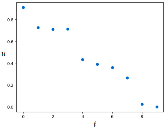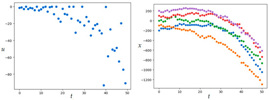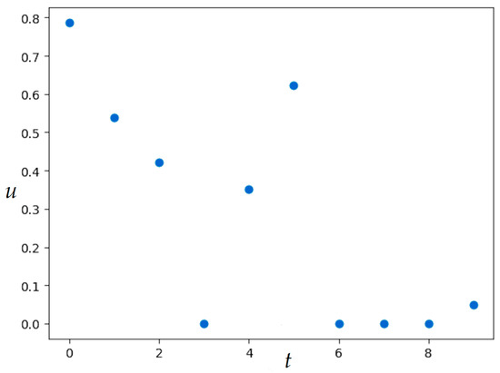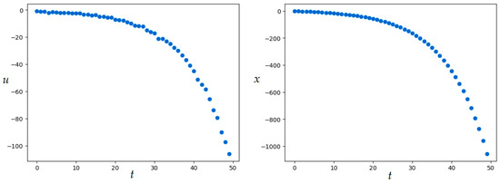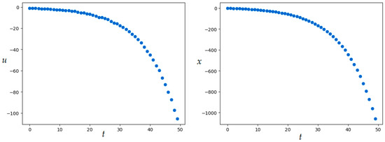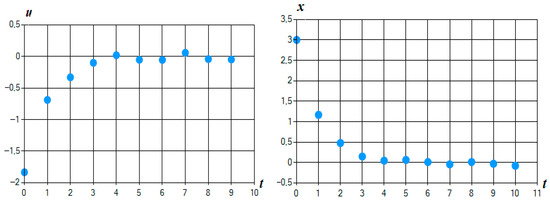 Set the number of discrete-time steps: . For the exact value of the quality functional is . SOMA parameters are given in Table 3. The resulting value of the quality functional is , numerical results were obtained in 2.2 min. Figure 13 shows the resulting optimal control and corresponding trajectory.