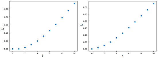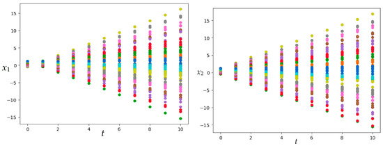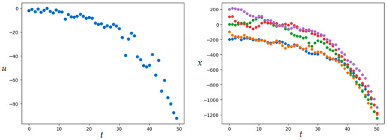 The results of solving Examples 1 and 2, presented in Figure 1, Figure 2, Figure 3, Figure 4, Figure 5 and Figure 6, demonstrate the influence of random external influences on the type of trajectories of a dynamical system. Comparing the graphs in Figure 1 and Figure 2 with Figure 7 and Figure 8 (Examples 1 and 3), as well as the graphs in Figure 3, Figure 4, Figure 5 and Figure 6 and Figure 9, Figure 10, Figure 11 and Figure 12 (Examples 2 and 4), one can conclude that the set of obtained trajectories of stochastic systems compared with a similar set of trajectories of deterministic systems are characterized by noticeable turbulence. At the same time, the patterns of behavior of controlled systems generally correspond to each other.