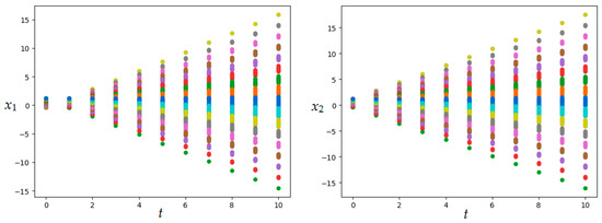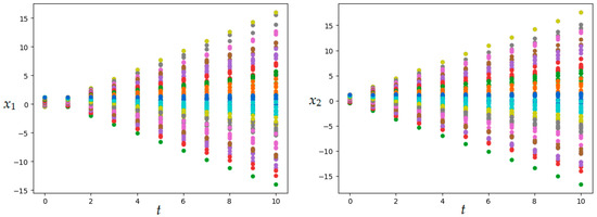 It is further assumed that set of initial states is a parallelepiped defined by the direct product of the segments i.e., . All segments with a step are divided into segments, and parallelepiped is divided into elementary subsets . In each elementary subset the initial state (center of the parallelepiped) is set. These initial states and the applied control generate trajectories on which the value of the functional (8) or (9) is calculated. After averaging over all realizations, the value of functional (11) is found.