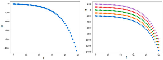 MSOMA parameters are given in Table 6. Figure 8 shows the resulting optimal control and bundle of trajectories. The resulting value of the quality functional for is ; numerical results were obtained in 730.24 s.