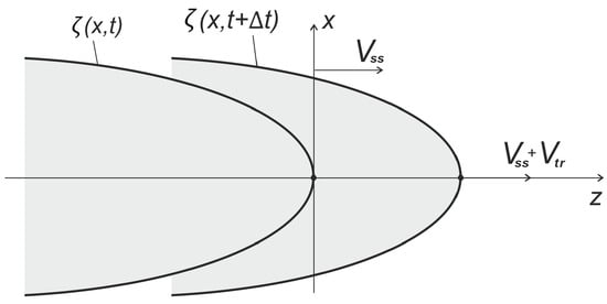 So, we consider a propagation of the curved solid/liquid interface into a pure undercooled liquid. The initial position of a flat interface lies in the x-plane (which is perpendicular to the growth direction z; see Figure A1). A curved solid/liquid phase interface then moves along the z axis and is characterized by the function , where t is the process time. At the solid/liquid interface, we have the following Gibbs–Thomson and heat balance equations: