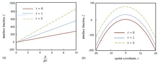 (a) The interface function versus at fixed and t. (b) The interface function versus spatial coordinate x at fixed and t. The calculations are made according to Equation (6).