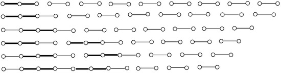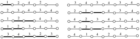 Next, we illustrate Theorem 5 for some 4-binomial forests of size 10, for which the number of components is 1, 2, or . Figure 3 shows red–blue colorings of the linear forests , , and of size 10, where four bold edges are red edges and six thin edges are blue edges. For , an edge labeled i belongs to the link in a Ramsey chain of length 4 in the linear forest.