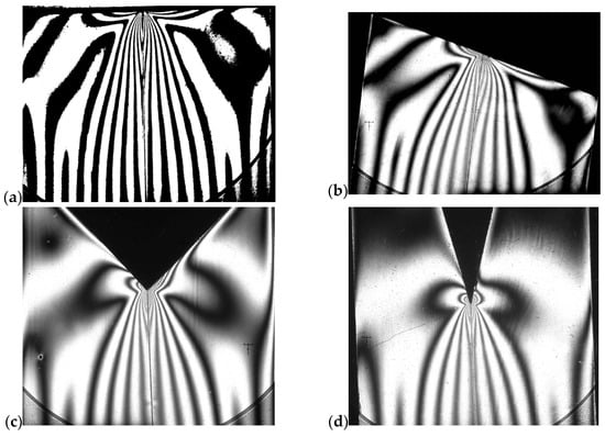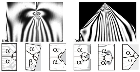 Images of fringes in models with thickness t = 3 mm for different cases of the angular cut-out in the model: (a) ; (b) ; (c) ; (d) ; and (e) —this is a narrow slot-like cut-out; (f) .