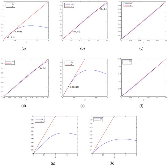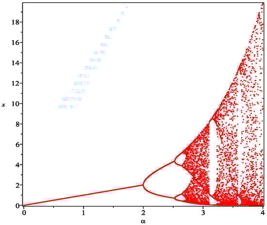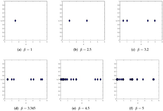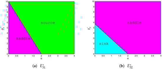 - When and the boundary fixed point exists in the map (5), and the eigenvalues of are and . So, the fixed point is always a source.