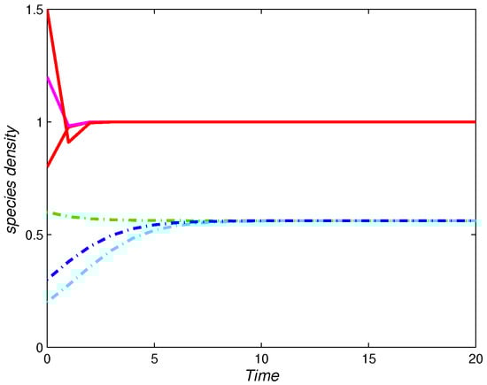 - Xie, X.D.; Miao, Z.S.; Xue, Y.L. Positive periodic solution of a discrete Lotka–Volterra commensal symbiosis model. Commun. Math. Biol. Neurosci. 2015, 2015, 2. [Google Scholar]