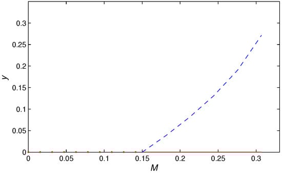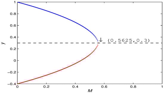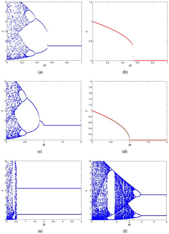 - A fold bifurcation for parameter at . In addition, with the increase of M, the number of positive fixed points of the map (5) has a 2-1-0 change. That is, when , there are and ; when , there is a unique positive fixed point , and when the positive fixed point disappears.