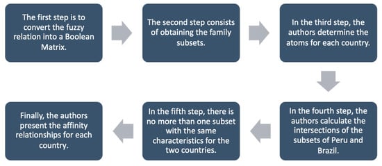 The first stage establishes a Boolean matrix of fuzzy relatedness of the sets and , cut at some appropriate levels. The second stage lies in obtaining the family of subsets of objects, each of which gathers those with the same characteristics. The third stage presents the corresponding clan from the non-empty mini-terms or atoms. The fourth stage details, for each of the elements of the clan, the calculations of the intersections of the subsets of characteristics possessed by the components of the respective elements of the clan. The fifth stage chooses the corresponding clan element with the largest number of components when more than one feature subset is repeated due to intersection. Finally, the sixth stage presents the meeting of the clan elements with the maximum number of repeated feature subsets forming the affinities. Next, the Fuzzy Logic algorithm is presented in more detail.