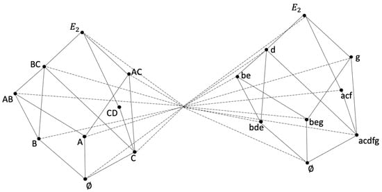 The concept of a power set is considered next. Given a finite set , we designate as its power set, , the one formed by all the possible combinations of its elements taken from 1 by 1, from 2 by 2, …, m by m, if m is its cardinal. In this way, the set obtained is given by: