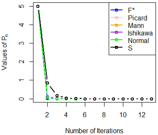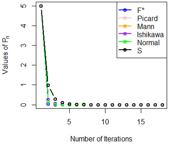 From Table 2, we observe that the numerical results for iterative scheme (5) converge strongly and faster to zero at the fourth iteration when compared to the normal-S iterative scheme, which converges at the seventh iteration and is the closest to our algorithm among the other iterative schemes in the literature. We present a graphical representation of our result in Figure 2.