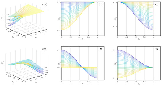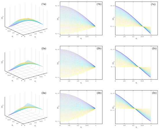 Figure 2. Among them, (a) is a three-dimensional image of the enterprises’ payoffs and effort level without quantum entanglement, (b) is and corresponds to projection on , (c) is , and corresponds to projection on .