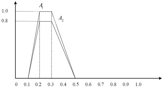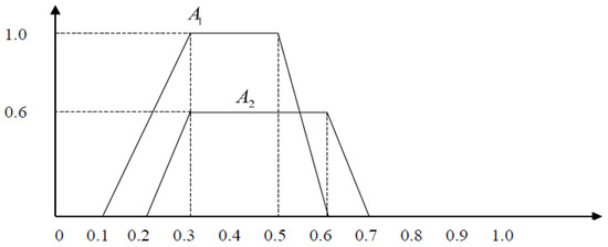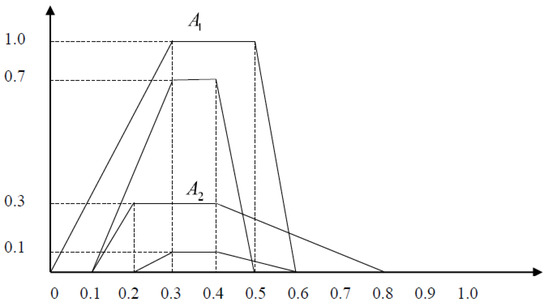 Figure 3. Fuzzy numbers A 1   and   A 2 of Set 2 in Example 2.