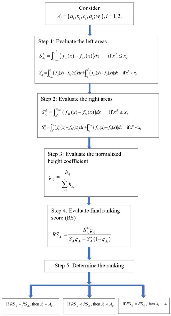 Wang and Luo [1] highlighted that ranking fuzzy numbers is a very important issue in fuzzy sets theory and applications and has been extensively researced. Some ranking methods have been reviewed and compared by [2,3,4]. Chou et al. [5] indicated that, nevertheless, none of these methods can always guarantee a consistent result in every situation, and some are even unintuitive and indiscriminate. Yu et al. [6] and Chi and Yu [7] emphasized that when fuzzy numbers are non-normal, some methods use height minimization ( min w i ) or normalization, which leads to information loss. Methods using min w i include the maximizing and minimizing sets for ranking fuzzy numbers used by [8] and the rank and mode approach for ranking generalized fuzzy numbers proposed by [5]. The method that first normalized fuzzy numbers before ranking them is where fuzzy numbers are ranked with an integral value, introduced by [9].