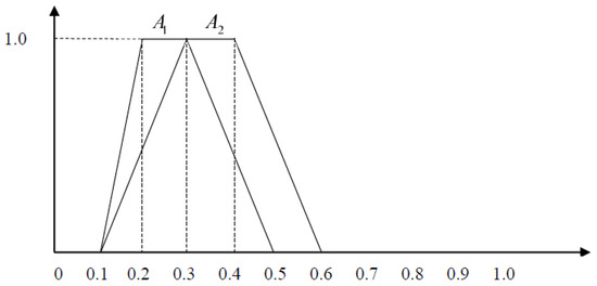 Figure 4. Fuzzy numbers A 1   and   A 2 of Set 3 in Example 3.