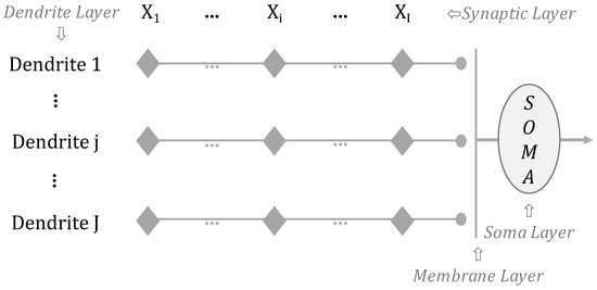 The dendritic layer employs multiplication, which has been considered to be the simplest nonlinear operation found in neurons [19] and is performed by each dendrite. In addition, the multiplication operator is equivalent to a logical AND operation when the dendritic layer receives constant-1 or constant-0 connections. As all signals transmitted by the synaptic layer will be received by the dendrites in the dendritic layer , the function of the jth dendrite is as follows: