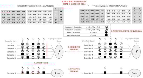 Meanwhile, Figure 2 depicts the DNM learning process, which includes five major steps: training algorithms, morphological conversion based on four connection states, dendritic pruning and its output, along with synaptic pruning and its output. Pruning can remove unnecessary dendrites and synapses, and it can also infer the number of dendrites in the presynaptic axon terminal and dendritic connection position, as well as how they are connected.