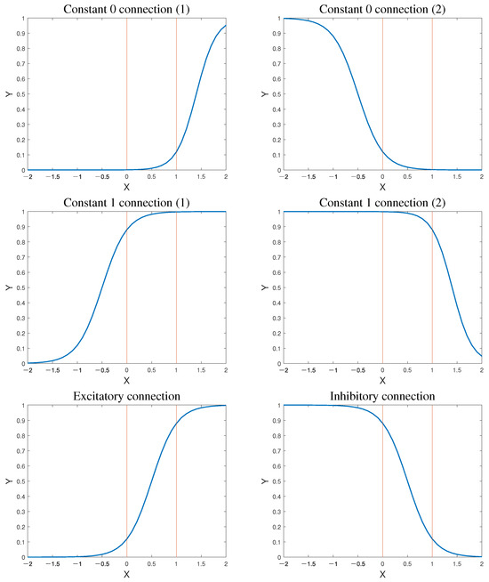 - Constant 1 connection: the potential of the postsynaptic cell is still close to 1 despite the input varying between 0 and 1 when (1) or (2) .