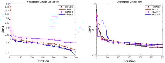 Table 4 shows the ablation experiment of HSHADE, where SHADE-R denotes that the original SHADE was used to train DNM-R, and SHADE-A denotes that HSHADE was used to train the original DNM. SHADE represents the result of training the original DNM using the original SHADE. Figure 4 and Figure 5 show the box and convergence graphs of the ablation experiment of HSHADE. First and foremost, when examining the convergence graph, it becomes evident that HSHADE outperforms the other three approaches significantly in terms of its convergence capability. It excels in its ability to discover globally optimal solutions, consistently approaching closer results when the other methods begin to stagnate. However, it is important to note that in classification problems, the issue of overfitting arises. Thus, a better fit during training does not necessarily translate to higher accuracy during testing. To account for this, we generated box plots of all the test results. For instance, in the Tic-tac-toe problem, HSHADE not only exhibits the highest median accuracy but also achieves the highest accuracy in a single instance. On the other hand, in the Vote problem, while HSHADE’s median accuracy falls slightly below that of HSHADE-only-trained DNM, its optimal solution demonstrates significantly higher accuracy than the other methods. This underscores the practical value of HSHADE, as it consistently possesses the potential to achieve the best solution. The difference between SHADE’s results in training DNM and DNM-R is not particularly pronounced, and its level of accuracy varies across different problems. However, SHADE, which relies solely on hyperparameter adaptation, exhibits a significant drop in performance on certain problems. Notably, it produces entirely incorrect training results for the Ionosphere problem. This issue arises from the introduction of two new dimensions, which significantly expands the algorithm’s search space and adversely affects its original convergence capability. Therefore, HSHADE should be used in conjunction with DNM-R. DNM-R, with its signal amplification capability, outperforms the DNM in terms of problem sensitivity, thereby strengthening the algorithm’s upper bound of convergence ability. On the other hand, the adaptive tuning of hyperparameters in HSHADE enhances the model’s feature resolution compared to setting parameters with a single decimal place. In summary, the experimental data strongly support the effectiveness and indispensability of HSHADE’s improvements, and HSHADE consistently demonstrates excellent performance.