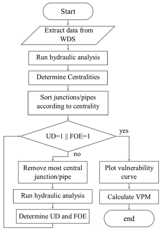 Figure 1 illustrates the RMCEF algorithm’s streamlined flow diagram. The algorithm removes the nodes or pipes according to the vector , runs the hydraulic analysis, and determines the unsatisfied demand using Equation (4) and the fraction of removed elements using Equation (5) until the demand is totally unsatisfied or all the elements are removed, i.e., UD(k) = 1 or FOE(k) = 1.