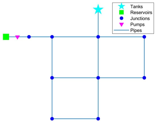 In a previous study [], a vulnerability assessment was performed on different benchmarks to evaluate the metrics of centrality and such outbreak techniques. However, these benchmarks did not include tanks, pumps, or external sources. In this section, the benchmarks employed include such elements and the Matlab algorithm was extended to be able to simulate their effect.