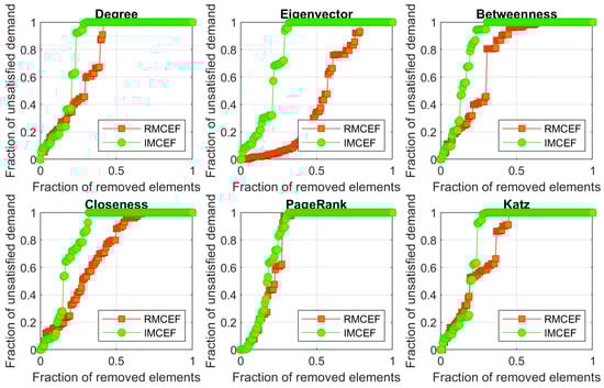 In this experiment, the IMCEF with betweenness centrality also presented the highest VPM followed by the eigenvector and PageRank. Examining Figure 14, the vulnerability curves for the degree, PageRank, and Katz centralities are similar for RMCEF and IMCEF strategies.