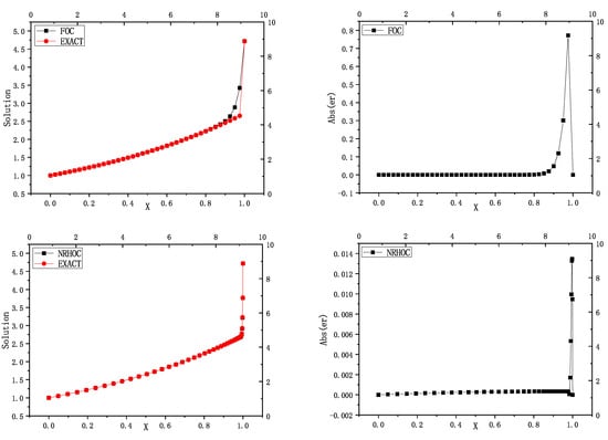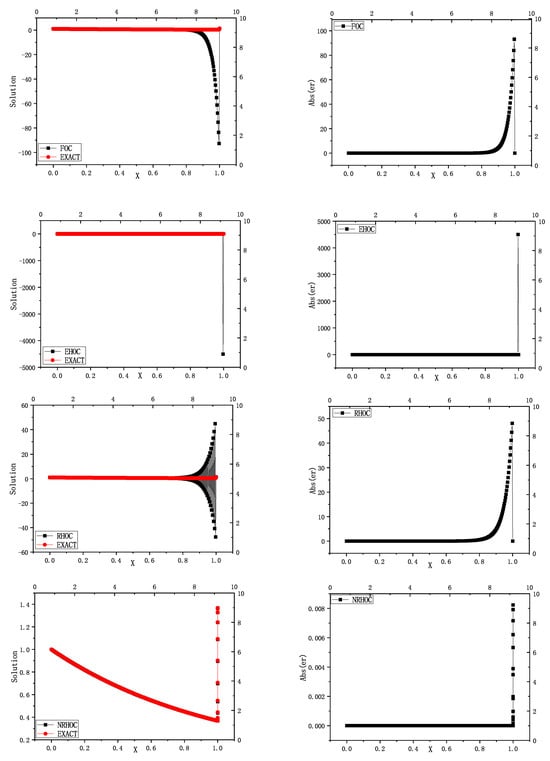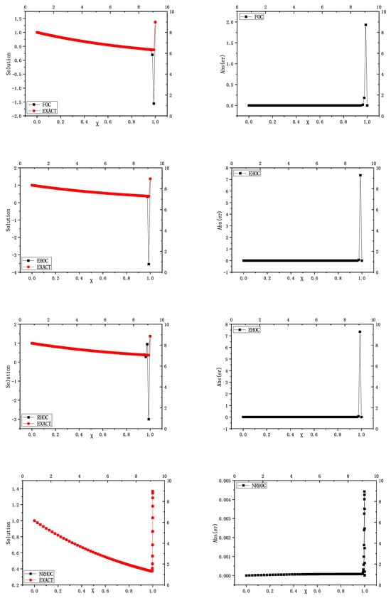 The boundary conditions are determined by the exact solution. When the Reynolds number () is large, The solution to this equation has a boundary layer at . We calculated the solutions for Reynolds numbers  using the NRHOC scheme and the HOC scheme []. Table 3 lists the computational error and convergence order when different values of  are taken. The computational data in the table show that compared with the HOC scheme, the NRHOC scheme has higher computational accuracy.