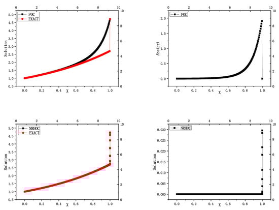 Figure 3 and Figure 4 give a comparison of the computed and exact solutions, and the error distribution over the computational region using the three difference schemes when  and , respectively. As shown in Figure 3 and Figure 4, the computational solutions obtained with the FOC scheme and the RHOC scheme all produce nonphysical oscillations near , while the NRHOC scheme matches well with the exact solution because there are enough computational nodes distributed in the boundary layer.