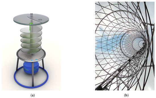Applications of ruled surfaces: (a) AI-enhanced image of a dew collector based on a ruled surface (helicoid) [13]. (b) The grid shell of the Shukhov Tower in Moscow, whose sections are doubly ruled. The image has been adapted from Wikipedia.
