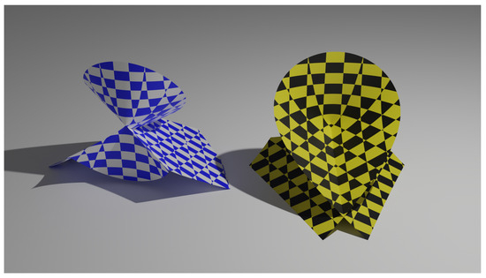 Another good way to illustrate singularities on surfaces is to use an environment map with uniformly distributed white circles on a black background. In this case, the circles will form flower-like patterns around the singularity (Figure 6). An environment map is a surface analysis tool used in CAD systems to visually evaluate surface smoothness, curvature, and other important properties using an image reflected in the surface. In principle, any image can be used as an environment map, and readers interested in environment maps in Rhinoceros 3D software are referred to [35]. Also, readers should not confuse environment maps with environments that have the *.renv file extension.