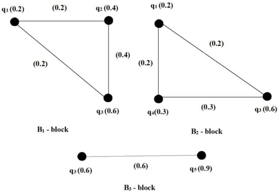 Conversely, let be an IVIFG in which every IVIF-block is complete. Construct using the conditions of the -intersection graph, and then generate a new by adding every vertex of having a number of end lines which is the same as the counting of the nodes of the block which are not the IVIF-cut nodes of G. Thus, it is very clear that is isomorphic to . □