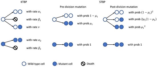 In contrast to the GTBP, we also define a “Simplified Two-Type Branching Process” (STBP) which is a special two-type MBP initiated by wild-type cell(s), with i.i.d. exponential lifetime for wild-type and mutant cells (i.e., non-differential growth) and binary-fission (i.e., Yule process), and without cell deaths or backward mutations. This model will be used throughout our simulation studies as described in Section 2.3. We note that the STBP is similar to Kendall’s two-type branching process (KTBP) [10], which is often known as the stochastic Luria–Delbrück model, with slight differences. The KTBP allows cell deaths and assumes that, upon division, each wild-type cell will either die, give birth to two wild-type offspring, or turn into one wild-type + one mutant cell, with certain rates; each mutant cell, on the other hand, will either die or divide into two mutant offspring with a certain rates [11]. However, in the STBP formulation, we assume all cells grow according to binary-fission with i.i.d. exponentially distributed lifetime, mutant cells always divide into two mutant offspring, and wild-type cells produce mutant offspring according to either pre- or post-division mutation. That is, for pre-division mutation, each wild-type cell will mutate with probability (, say) right before its division, but for post-division mutation, each wild-type cell will first divide into two wild-type offspring, then these two offspring will mutate independently with probability () right after the division. In other words, from the wild-type cell perspective, the offspring distribution probability generating function (PGF) is for pre-division mutation, and for post-division mutation. A schematic plot is shown in Figure 1 to illustrate cell mutations in the KTBP and STBP models.