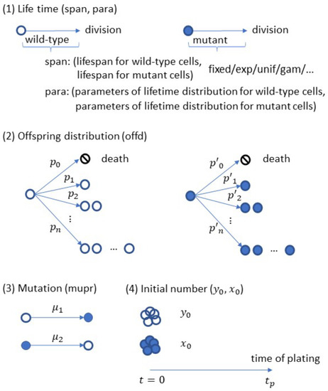 among which the first one “bran” (structured as an R list object) determines the branching rule of cell proliferation. In this list object, the “bran$span” component takes a character string, e.g., “fixed”, “exp”, “unif”, or “gam”, to specify the cell lifetime distribution (allowed to be different for wild-type and mutant cells). The “bran$para” component is a vector or matrix which provides the lifetime distribution parameters in a pair, for example, if “bran$span= ‘exp’ ”, then “bran$para= ‘c(1, 2)’ ” means the exponential rate parameter for wild-type cells is 1 and for mutant cells is 2. The third and last component “bran$offd” is a vector specifying the offspring distribution, so “bran$offd= ‘c(0,0,2)’ ” means binary-fission (if necessary, the wild-type and mutant cells can have different offspring distributions by changing “bran$offd” to a matrix with two rows). The second input of the SimuBP function, “mupr=c()”, is a vector specifying the forward and backward mutation probabilities. The third input vector, “n0=c()”, specifies the initial number of wild-type and mutant cells. The last input “tp” is a scalar for the time of plating. Actually, both the time of plating and the population size at the time of plating can be used as input, however, considering the stochastic growth assumption of the GTBP, the former should be more appropriate for this simulator. For better illustration, these input arguments are shown in a schematic plot in Figure 2. The output of SimuBP is simply a vector where is the number of mutant cells at and is the total number of viable cells at .