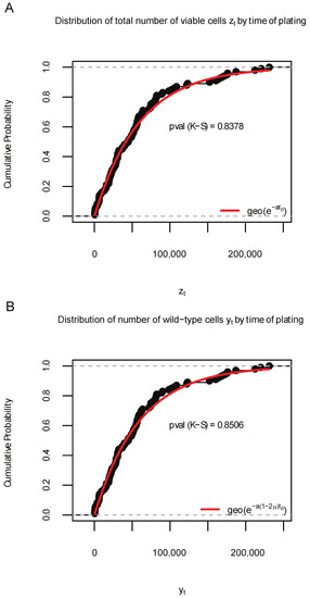 Appendix A.2. Comparison between the Distribution of Data Samples Generated by SimuBP and the Luria–Delbrück Distribution