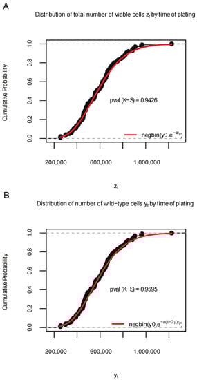 Distribution of 100 data samples generated by SimuBP in Simulation S1b. (A): Empirical cumulative distribution function (ECDF) of the total number of viable cells when the time of plating . (B): ECDF of the number of wild-type cells when . The red curves represent the cumulative distribution function of the theoretical negative binomial distributions in comparison. The Kolmogorov–Smirnov (K-S) test p-values are shown under the ECDF curves.