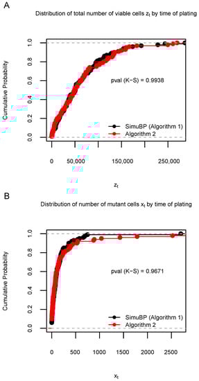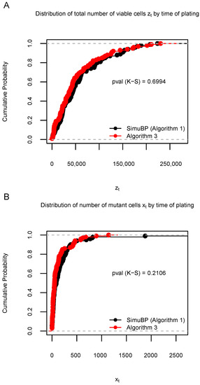 Distribution of 100 data samples generated by Algorithms 1 and 3 in Simulation S2b. (A): Empirical cumulative distribution function (ECDF) of the total number of viable cells when the time of plating . (B): ECDF of the number of mutant cells when . The Kolmogorov–Smirnov (K-S) test p-values are shown under the ECDF curves.