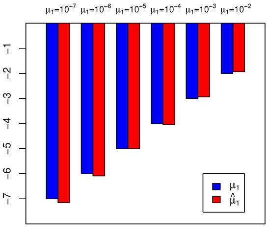In Simulation S3a, we generated data for and in parallel cultures using SimuBP. The simulated data is based on an STBP with exponential rate 1 and unit initial number of cells (i.e., ). In particular, six different settings on the mutation probability and the time of plating (both assumed unknown in estimation) were considered, including . Based on the simulated data from parallel cultures , we estimated by solving Equation (8) in [12] via the Newton–Raphson method. Repeating the procedure 100 times, we plotted the mean of the estimated together with its true value in scale in a barplot in Figure 7, for different values of . The mean squared errors corresponding to are: , respectively.