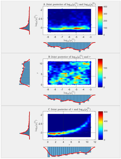 Simulation S3b is based on the same STBP model as in S3a except that the mutation rate parameter (for forward mutation only) is changed to a piece-wise constant function , where represent the mutation probabilities in the first and second stages, respectively, and represents the transition time from stage 1 to stage 2. Denote the unknown parameters by . Clearly, estimating the three components of simultaneously would be an impossible task for existing mutation rate estimators. Here we adopted the GPS-ABS approach proposed in [16], which is a likelihood-free, simulation-based estimator via approximate Bayesian computation (ABC) equipped with a Gaussian process surrogate. Briefly speaking, the basic idea of using ABC to estimate parameters without explicit likelihood is “trial and error” through extensive simulations. By repeatedly simulating data and accepting those that are close to the observed data, ABC is able to keep “good” posterior samples of the parameters by using the Metropolis-Hastings algorithm. These posterior samples are then used for inference purposes. In this simulation study, SimuBP was used not only to generate the observed data from the two-stage mutation model but also to train the Gaussian process surrogate to improve the computational efficiency. A total of 50,000 posterior samples of were collected by applying the GPS-ABC algorithm. Treating the first 35,000 as the burn-in samples of MCMC, we plotted in Figure 8 the heatmap of the joint posterior distribution of each of the two parameters in , with the marginal posterior distributions shown along the axes. Despite the multimodal shape of the posterior distributions (especially for the two parameters and as seen in Figure 8B) caused by lack of identifiability of the three model parameters, if we use the highest posterior mode of the joint distribution for posterior inference, the point estimation result is and , close to their true values.