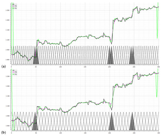The time series is depicted together with fuzzy partitions with the basic functions of the width: (a) and (b) . In both images are marked basic functions over which the structural breaks are detected.