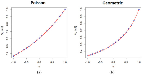 Graphs of PGFs (lines) and empirical PGFs (dots) of the IID series: (a) Poisson distribution; (b) geometric distribution. (True parameter value is ).