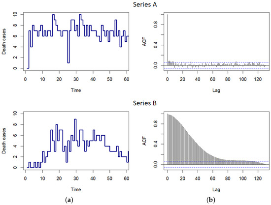Some confirmation of these observations can also be seen in Table 4, where its upper part shows the basic descriptive statistical analysis of the both time series. In the case of Series A, the existence of an equal-dispersion property can be recognized through ’close’ values of its sample mean and variance. Thus, this series can be modeled with a Poisson distribution. On the other hand, with Series B, there is a wide range and variability of observed data. Additionally, it can be seen that frequencies of ‘smaller’ numerical values are emphasized (its mode equals 1). Therefore, it could be assumed that, in the INAR(1) model, innovations with a Poisson distribution (and a ‘small’ parameter ) can be taken, as well as with a geometric distribution. In accordance with the mentioned facts, we modeled the dynamics of the Series B by using the INAR(1) process with geometric distributed innovations . Finally, the lower part of Table 4 shows some of the estimated values for the ACFs of both observed time series. Obviously, the obtained autocorrelation values of Series A are not statistically significant, so it can be considered as an IID time series. Conversely, the estimated ACF values of Series B indicate the possibility of modeling the dynamics of this time series using the INAR(1) process.